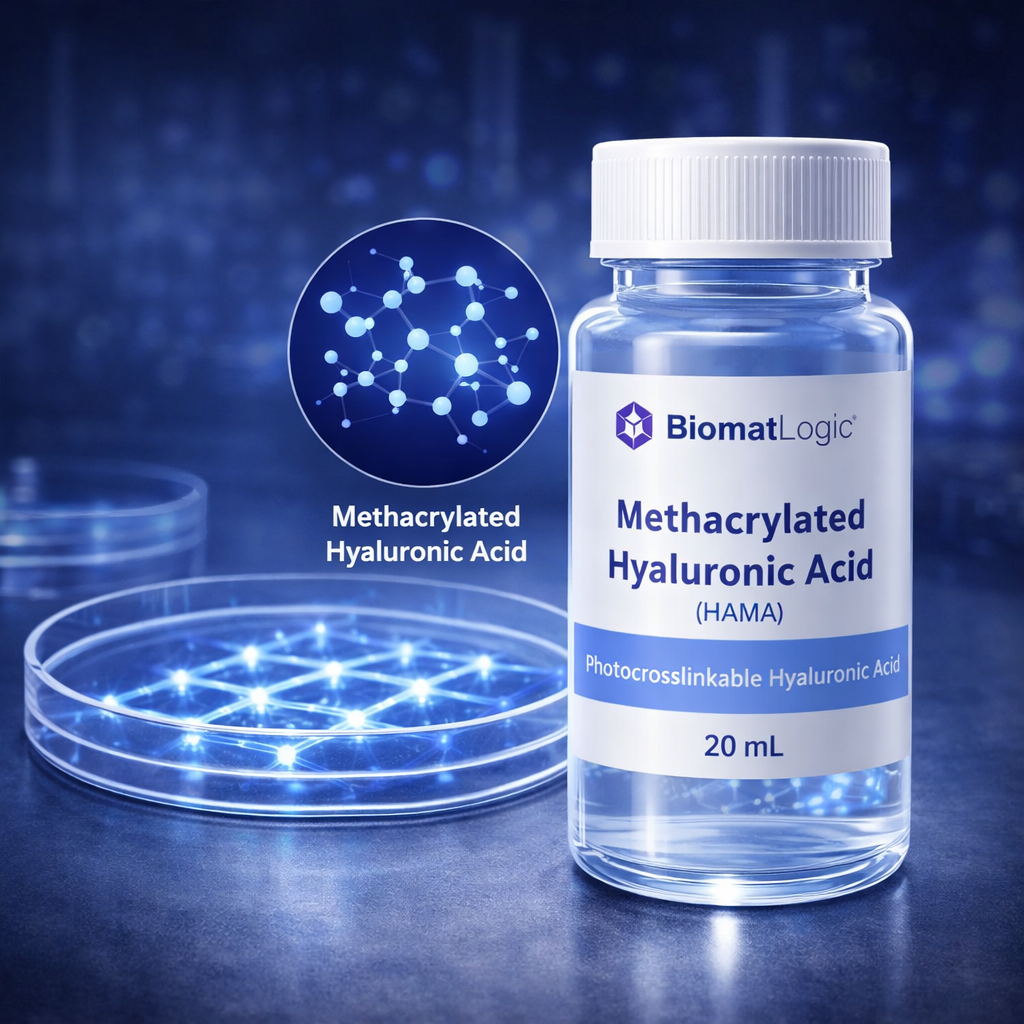 Methacrylated Hyaluronic Acid (HAMA) is a modified form of hyaluronic acid designed to enable photocrosslinking into stable hydrogel networks. By introducing methacrylate groups onto the HA backbone, the material can be rapidly crosslinked under UV or visible light in the presence of a photoinitiator. This allows precise control over gelation, stiffness, and network structure while maintaining the biological relevance of native hyaluronic acid.