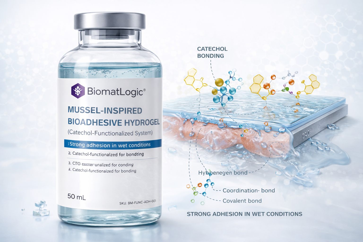 Mussel-Inspired Bioadhesive Hydrogel (Catechol-Functionalized System) is engineered using catechol-containing functional groups (e.g., dopamine derivatives) that mimic the adhesive proteins found in mussels. These functional groups enable strong and versatile adhesion to a wide range of surfaces, including biological tissues, metals, oxides, and polymers—even under wet conditions.