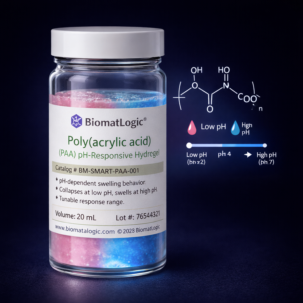Poly(acrylic acid) (PAA) pH-Responsive Hydrogel is a smart biomaterial designed to respond dynamically to changes in pH. The polymer contains ionizable carboxylic acid groups that become charged at higher pH, causing electrostatic repulsion and swelling of the hydrogel network. At lower pH, the network collapses due to protonation, enabling reversible structural transitions.